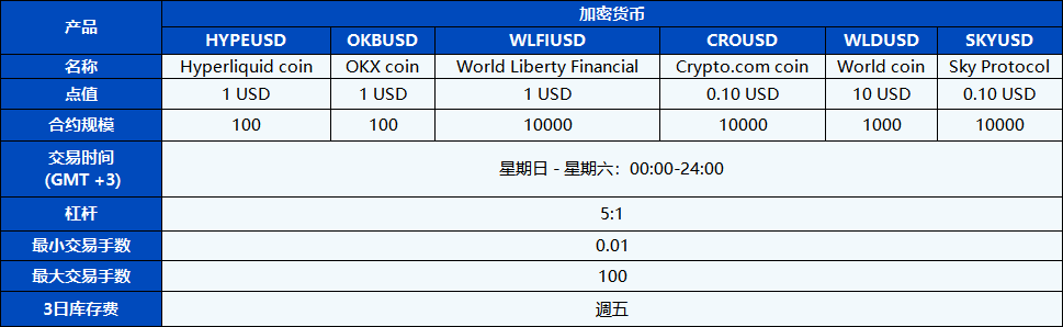 我们很高兴地宣布,PU Prime 将于 2025 年 10 月 18 日起在 MT5 服务器上推出一系列新的加密货币产品——HYPEUSD、OKBUSD、WLFIUSD、CROUSD、WLDUSD 和 SKYUSD,以为客户提供更广泛的产品组合。