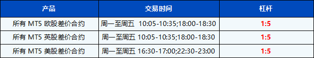 此外,在MT5上开盘后30分钟和收盘前30分钟内,所有股票差价合约新开头寸的杠杆自动调整为 1:5。