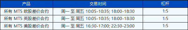 在上述交易时间内,MT5 Shares 差价合约产品的杠杆率被设定为1:5,开立任何新头寸都需额外保证金。一旦新开立的头寸超出上述交易时间,杠杆将自动恢复到1:20。
