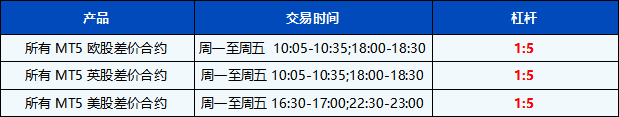 此外,在MT5上开盘后30分钟和收盘前30分钟内,所有股票差价合约新开头寸的杠杆自动调整为 1:5。
