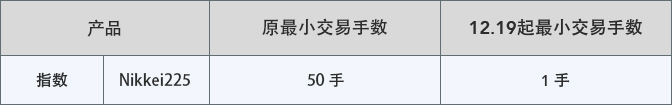 您好,为提升客户的交易体验,PACIFIC UNION Nikkei225 (日经225) 的最小交易手数由2020年12月19日起将有所调整。
