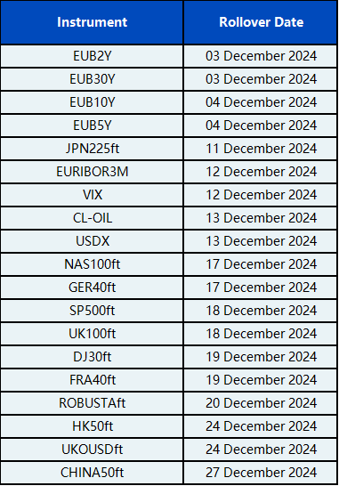Please be advised that the following CFD instruments will be automatically rolled over as per the dates in the table below. As there can be a pricing difference between old and new futures contracts, we recommend clients to monitor their positions closely and manage positions accordingly.