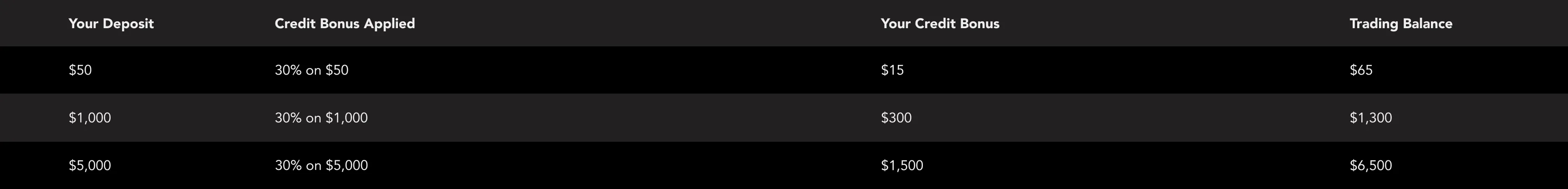 2.Only a new deposit during the promotion can apply for the credit bonus. A new deposit does not include the funds transfer between the accounts that are under the same name (internal transfer), refer-a-friend bonuses, and cash adjustments.