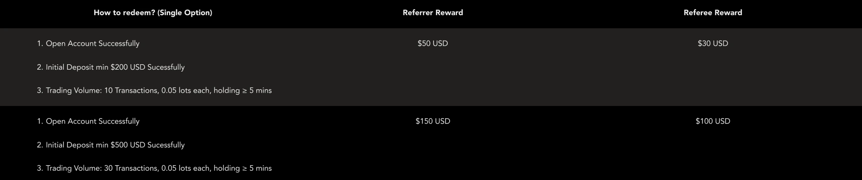 7. This refer reward display within the client portal promotion page and be shown in the form of exchange coupon. After the referred client completes all the conditions, both parties can obtain the corresponding exchange coupon. By clicking the “Redeem”, the coupon amount will be transferred to the balance of the trading account automatically. The coupon shown at different stage: